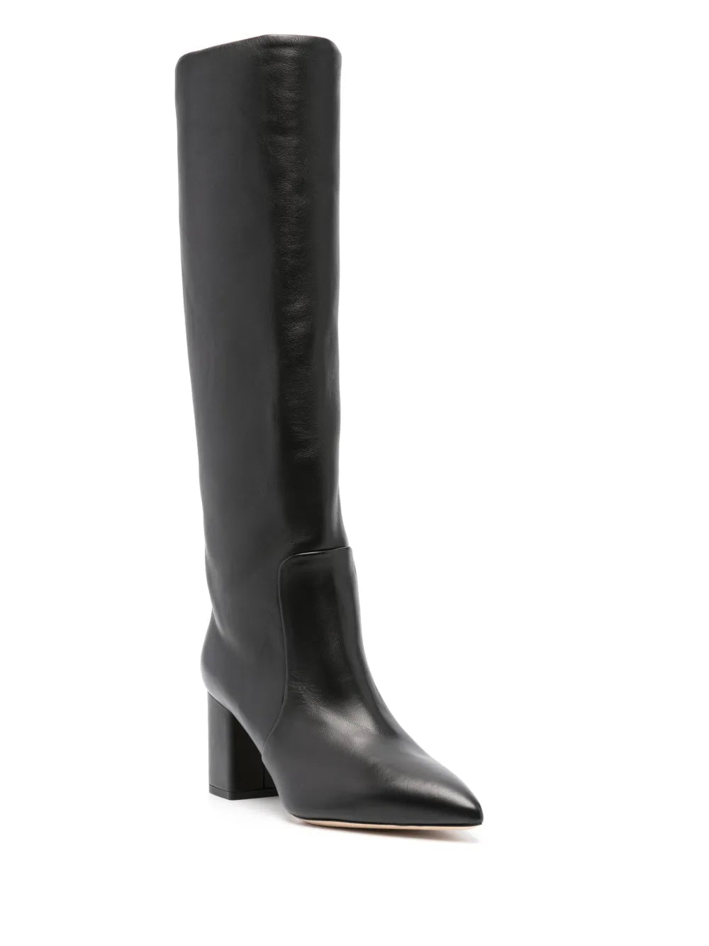 Czarny, skóra cielęca, design slip-on, wysoki blokowy obcas 90mm, spiczasty czubek, skórzana podeszwa, do kolan